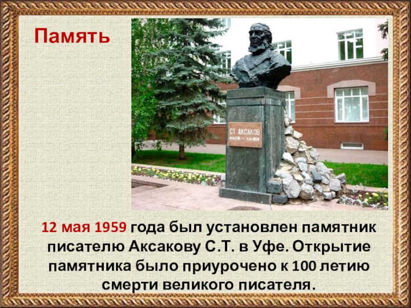 Слайд 2012 мая 1959 года был установлен памятник писателю Аксакову С.Т. в