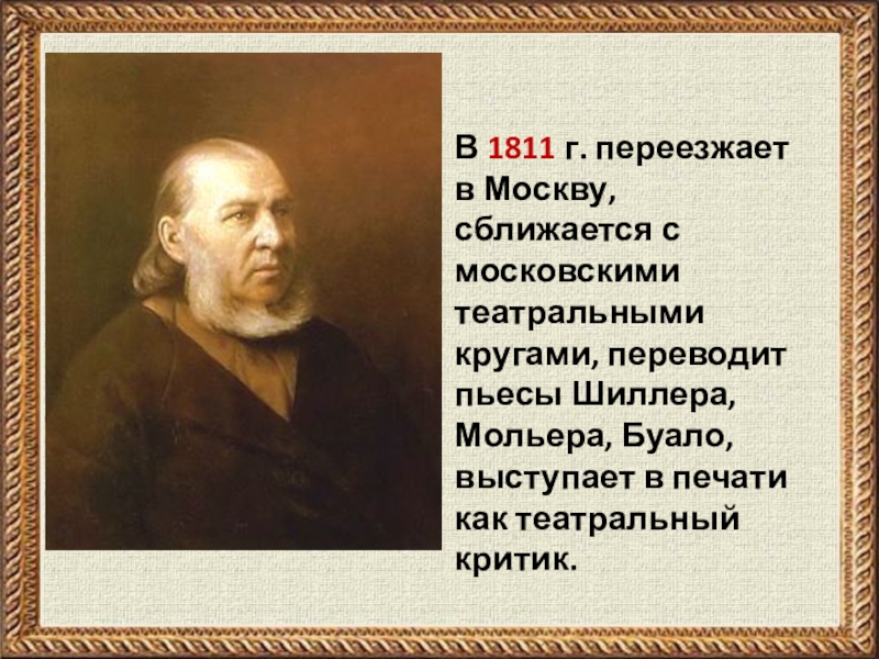 Слайд 8В 1811 г. переезжает в Москву, сближается с московскими театральными кругами,