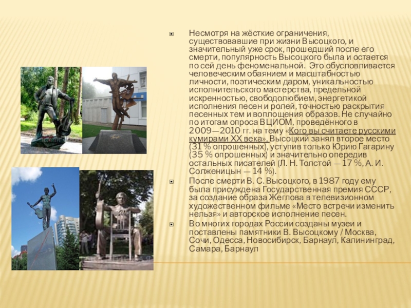 Во многих городах России созданы музеи и поставлены памятники В. Высоцкому / Москва, Сочи, Одесса, Новосибирск, Барнаул, Калининград, Самара, Барнаул