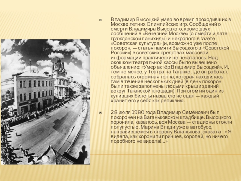 Сообщений о смерти Владимира Высоцкого, кроме двух сообщений в «Вечерней Москве» (о смерти и дате гражданской панихиды) и некролога в газете «Советская культура» (и, возможно уже после похорон, — статья памяти Высоцкого в «Советской России») в советских средствах массовой информации практически не печаталось. Над окошком театральной кассы было вывешено объявление: «Умер актёр Владимир Высоцкий». И, тем не менее, у Театра на Таганке, где он работал, собралась огромная толпа, которая находилась там в течение нескольких дней (в день похорон были также заполнены людьми крыши зданий вокруг Таганской площади). При этом ни один из купивших билеты назад его не сдал — каждый хранит его у себя как реликвию.