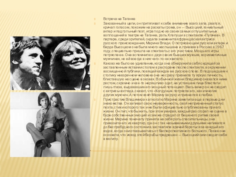 В июле 1967 года Владимир Высоцкий познакомился с французской актрисой русского происхождения Мариной Влади (Мариной Владимировной Поляковой), ставшей его третьей женой (декабрь 1970 года).