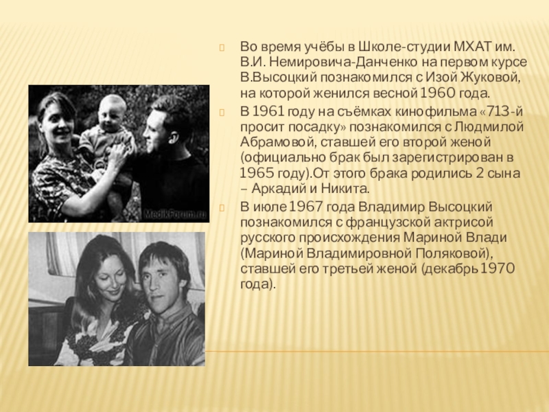 на первом курсе В.Высоцкий познакомился с Изой Жуковой, на которой женился весной 1960 года.