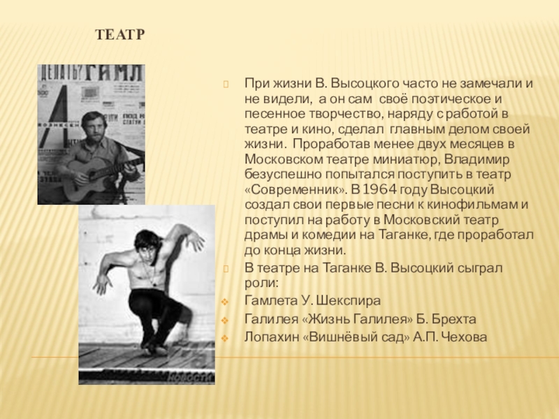 он сам своё поэтическое и песенное творчество, наряду с работой в театре и кино, сделал главным делом своей жизни. Проработав менее двух месяцев в Московском театре миниатюр, Владимир безуспешно попытался поступить в театр «Современник». В 1964 году Высоцкий создал свои первые песни к кинофильмам и поступил на работу в Московский театр драмы и комедии на Таганке, где проработал до конца жизни.