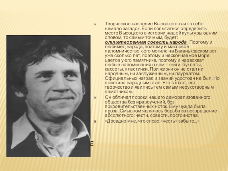 определить место Высоцкого в истории нашей культуры одним словом, то самым точным, будет: олицетворенная совесть народа . Поэтому и любимец народа, поэтому и массовое паломничество к его могиле на Ваганьковском вот уже сколько лет, поэтому и нескончаемое море цветов у его памятника, поэтому и нарасхват любые напоминания о нём - книги, буклеты, кассеты, пластинки. При жизни он не стал ни народным, ни заслуженным, ни лауреатом. Официальных наград и званий удостоен не был. Но поистине народным стал. Его талант, его творчество и явились тем самым нерукотворным памятником.