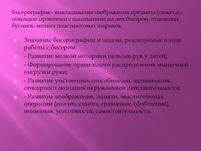 Значение бисерографии и задачи, реализуемые в ходе работы с бисером: