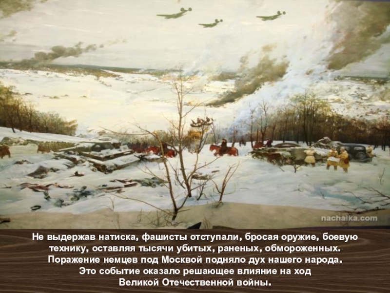 технику, оставляя тысячи убитых, раненых, обмороженных. Поражение немцев под Москвой подняло дух нашего народа. Это событие оказало решающее влияние на ход Великой Отечественной войны.