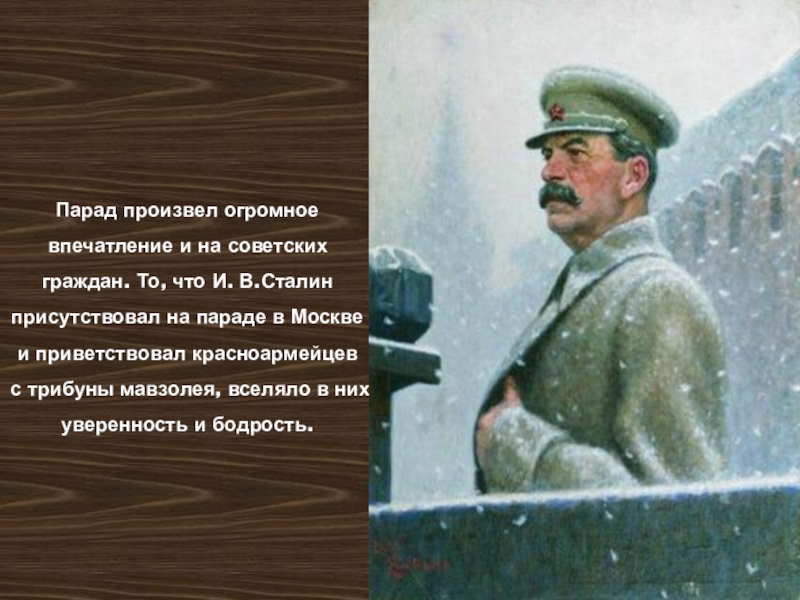 Слайд 20Парад произвел огромное впечатление и на советских граждан. То, что И. В.Сталин присутствовал на параде