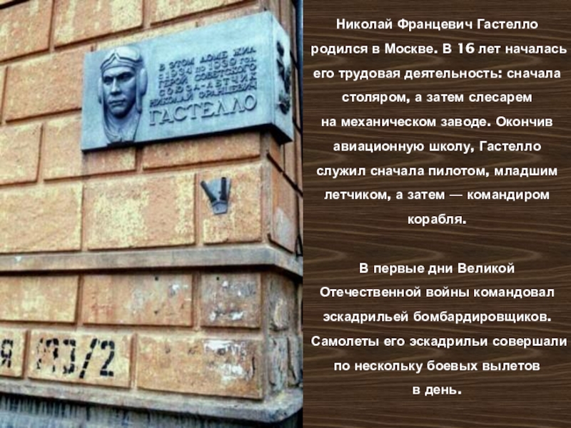 Слайд 42Николай Францевич Гастелло родился в Москве. В 16 лет началась его трудовая деятельность: сначала