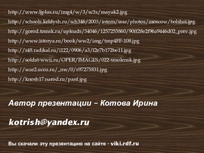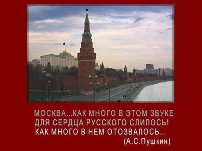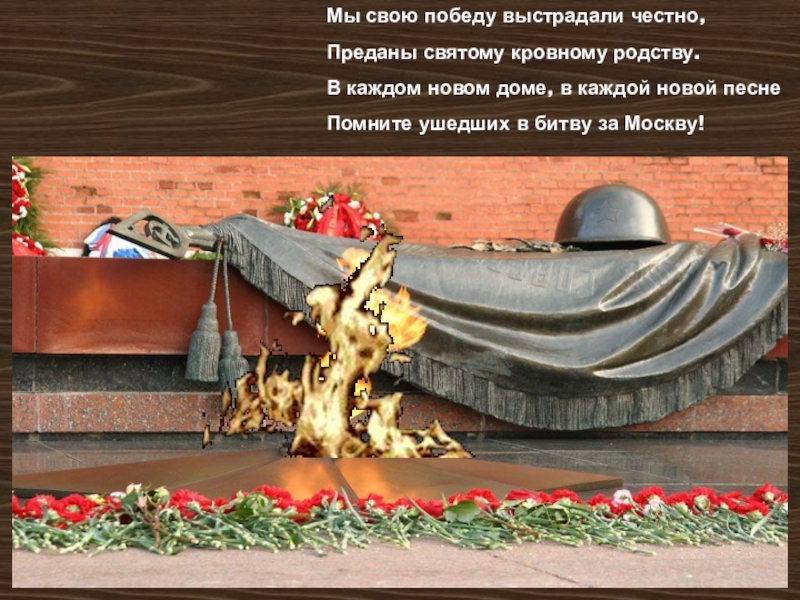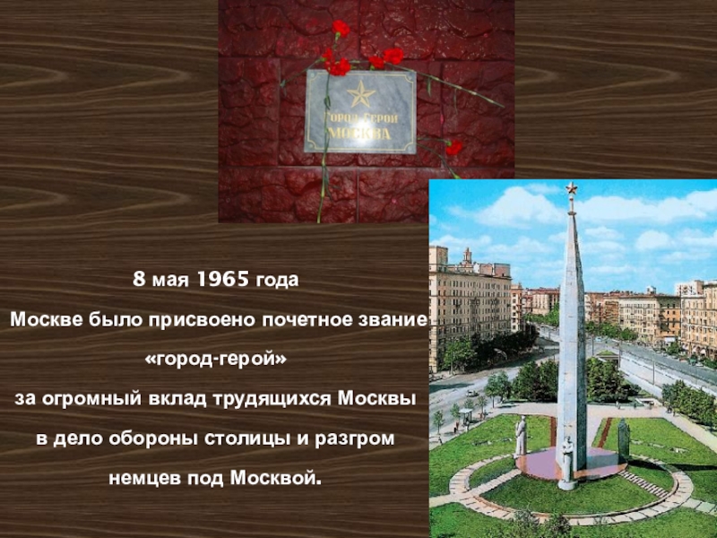 советских людей всего свободолюбивого человечества. Москва была для них олицетворением героизма и справедливости, стойкости и мужества. Москва, москвичи и вся страна никогда не забудут тех дней. В бронзе, граните и мраморе обелисков, мемориальных досок, стел, в названиях улиц, площадей Москва увековечила память славных воинов, ставших гордостью нашего народа.