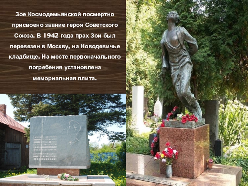 Слайд 54Зое Космодемьянской посмертно присвоено звание героя Советского Союза. В 1942 года прах