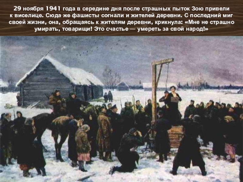 Слайд 5329 ноября 1941 года в середине дня после страшных пыток Зою привели к виселице. Сюда же