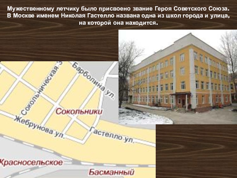 Слайд 44Мужественному летчику было присвоено звание Героя Советского Союза. В Москве именем Николая