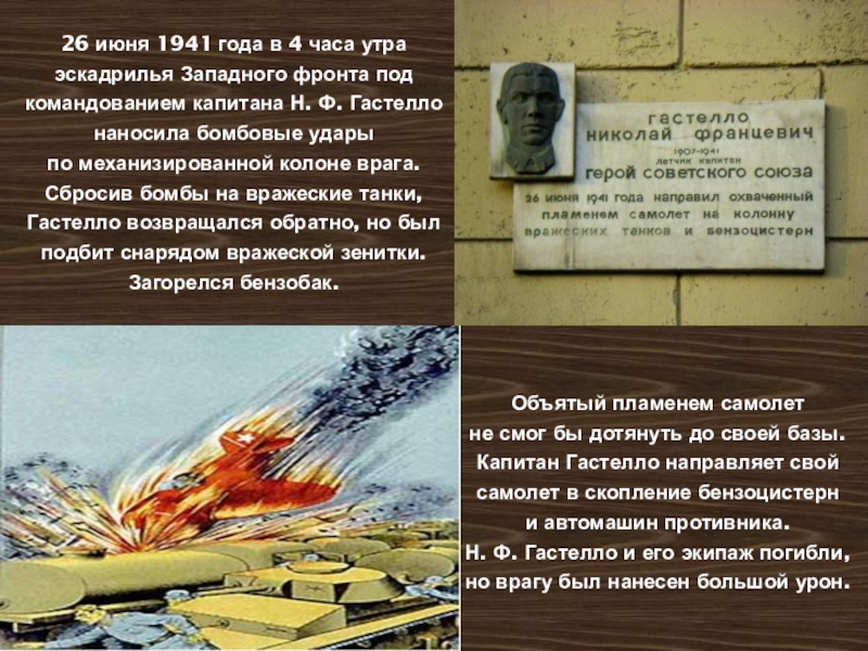 Объятый пламенем самолет не смог бы дотянуть до своей базы. Капитан Гастелло направляет свой самолет в скопление бензоцистерн и автомашин противника. Н. Ф. Гастелло и его экипаж погибли, но врагу был нанесен большой урон.