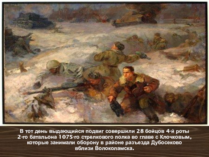 2-го батальона 1075-го стрелкового полка во главе с Клочковым, которые занимали оборону в районе разъезда Дубосеково вблизи Волоколамска.