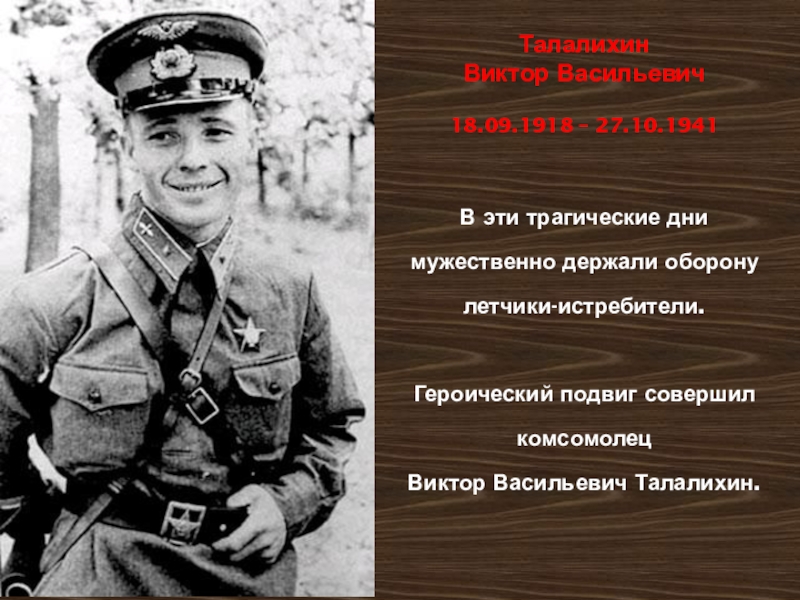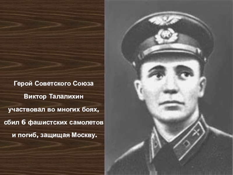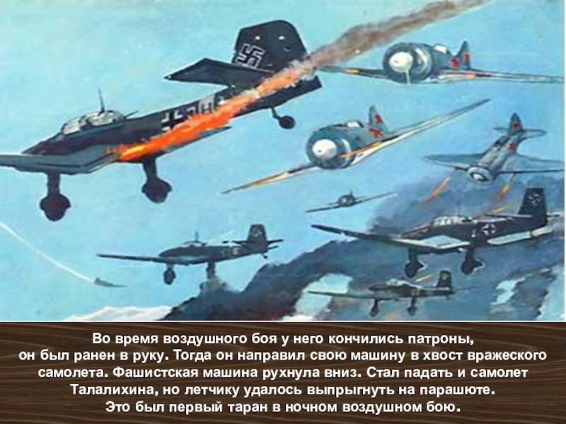 он был ранен в руку. Тогда он направил свою машину в хвост вражеского самолета. Фашистская машина рухнула вниз. Стал падать и самолет Талалихина, но летчику удалось выпрыгнуть на парашюте. Это был первый таран в ночном воздушном бою.