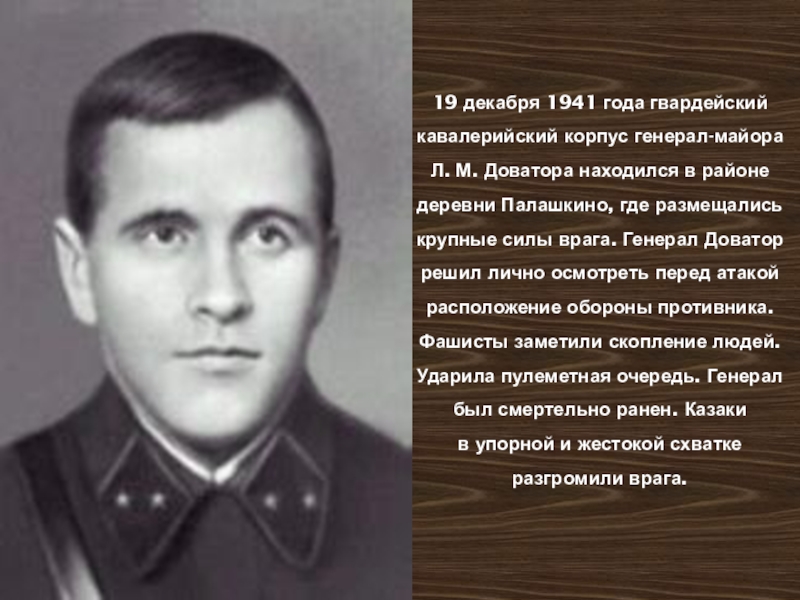 19 декабря 1941 года гвардейский кавалерийский корпус генерал-майора Л. М. Доватора находился в районе деревни