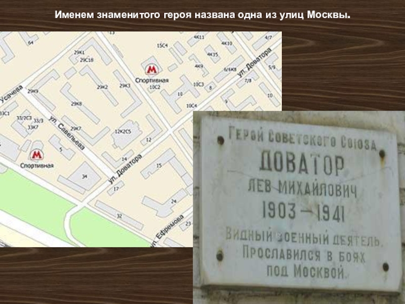 Слайд 50Именем знаменитого героя названа одна из улиц Москвы.
