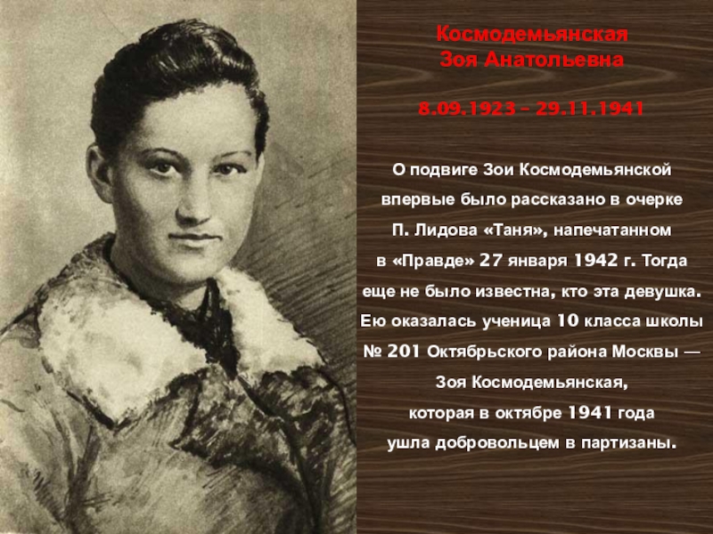 П. Лидова «Таня», напечатанном в «Правде» 27 января 1942 г. Тогда еще не было известна, кто эта девушка. Ею оказалась ученица 10 класса школы № 201 Октябрьского района Москвы — Зоя Космодемьянская,