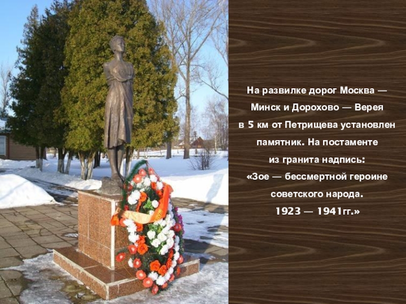 Слайд 55На развилке дорог Москва — Минск и Дорохово — Верея в 5 км от Петрищева установлен памятник. На постаменте