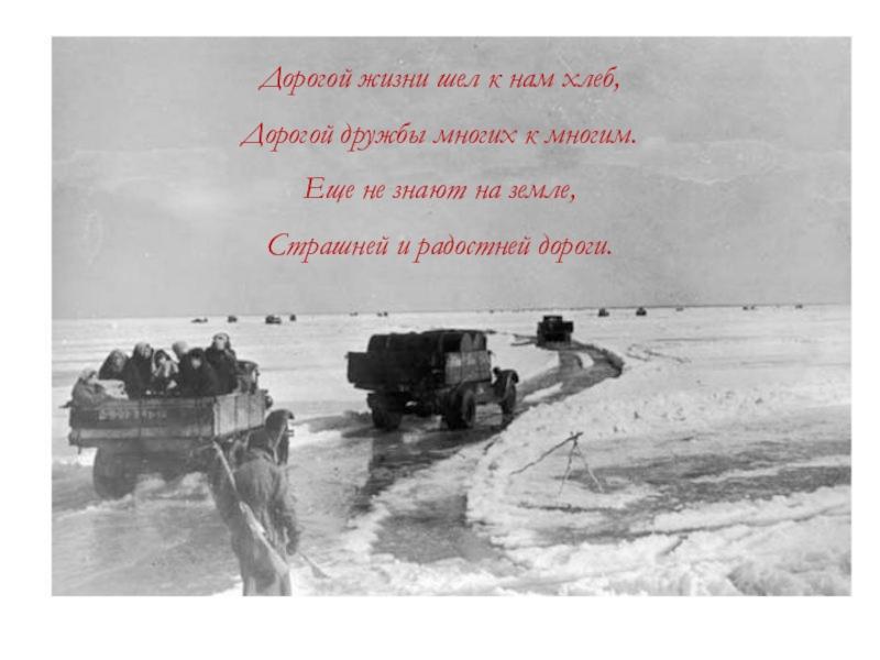 Дорогой жизни шел к нам хлеб,Дорогой дружбы многих к многим.Еще не знают на земле,Страшней и радостней дороги.
