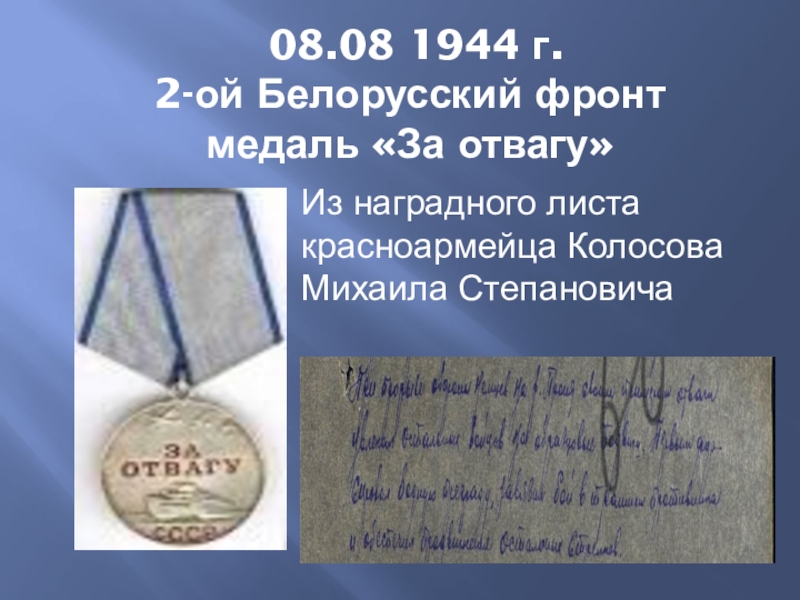 Слайд 12 08.08 1944 г. 2-ой Белорусский фронт медаль «За отвагу»