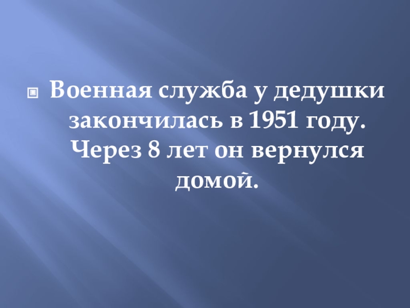 Слайд 9Военная служба у дедушки закончилась в 1951 году. Через 8 лет