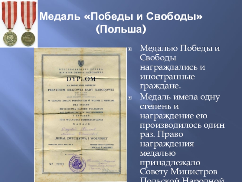 Медаль «Победы и Свободы» (Польша)Медалью Победы и Свободы награждались и иностранные граждане. Медаль имела одну степень и