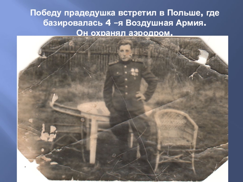 Слайд 8Победу прадедушка встретил в Польше, где базировалась 4 –я Воздушная Армия. Он