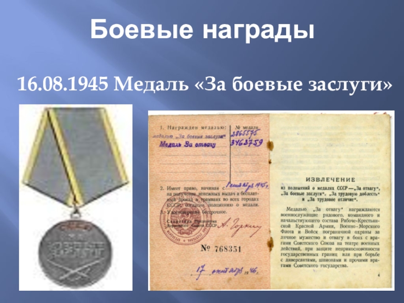 Боевые награды   16.08.1945 Медаль «За боевые заслуги»
