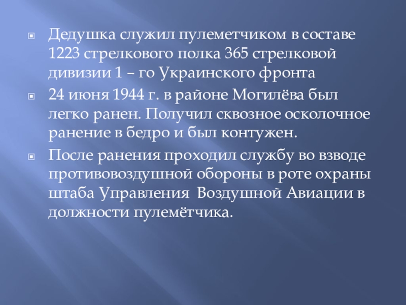 Дедушка служил пулеметчиком в составе 1223 стрелкового полка 365 стрелковой дивизии 1 – го Украинского фронта24 июня