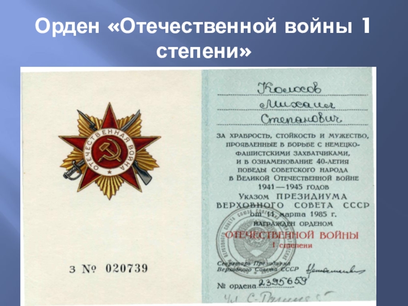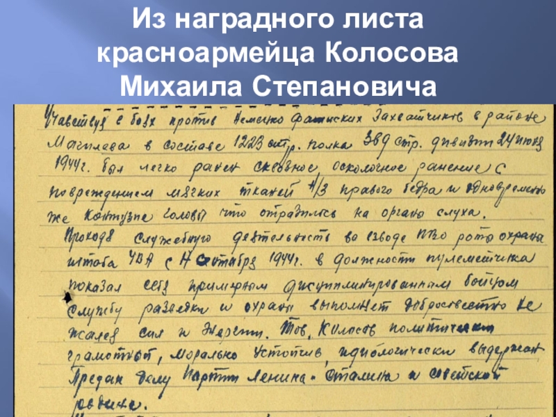 Слайд 6Из наградного листа красноармейца Колосова Михаила Степановича