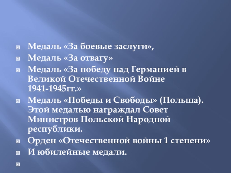 Медаль «За боевые заслуги»,Медаль «За отвагу»Медаль «За победу над Германией в Великой Отечественной Войне 1941-1945гг.»Медаль «Победы и