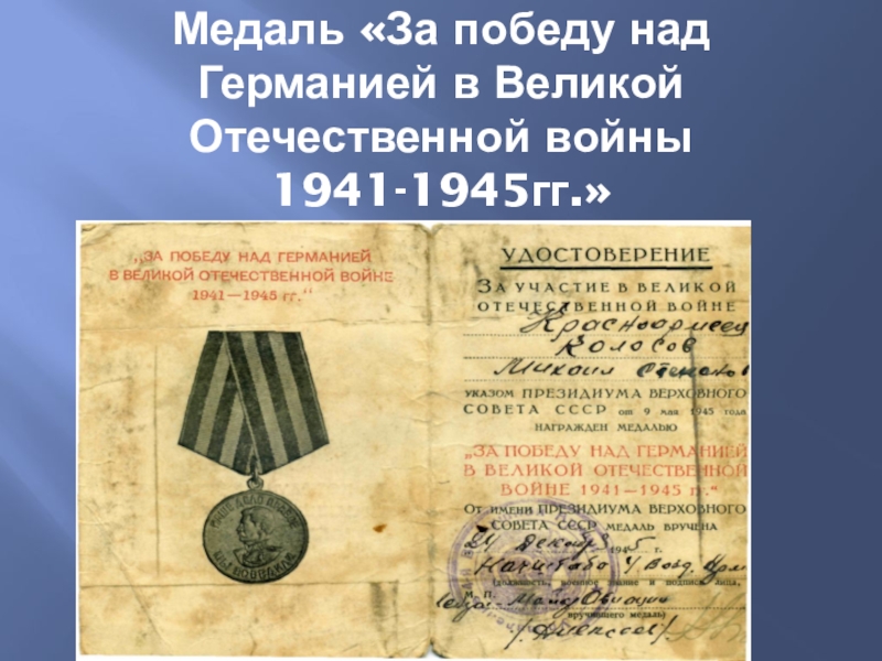 Слайд 13 Медаль «За победу над Германией в Великой Отечественной войны 1941-1945гг.»