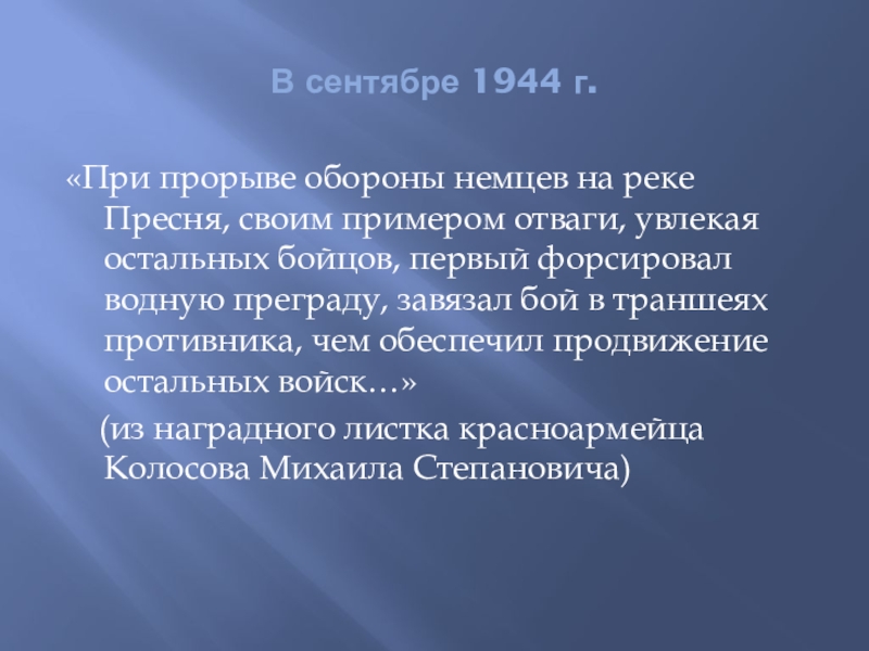 В сентябре 1944 г.«При прорыве обороны немцев на реке Пресня, своим примером отваги, увлекая остальных бойцов, первый