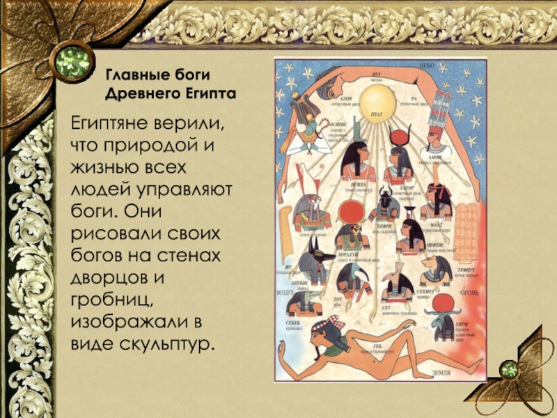 Главные боги Древнего ЕгиптаЕгиптяне верили, что природой и жизнью всех людей управляют боги. Они рисовали своих богов на стенах дворцов и гробниц, изображали в виде скульптур.
