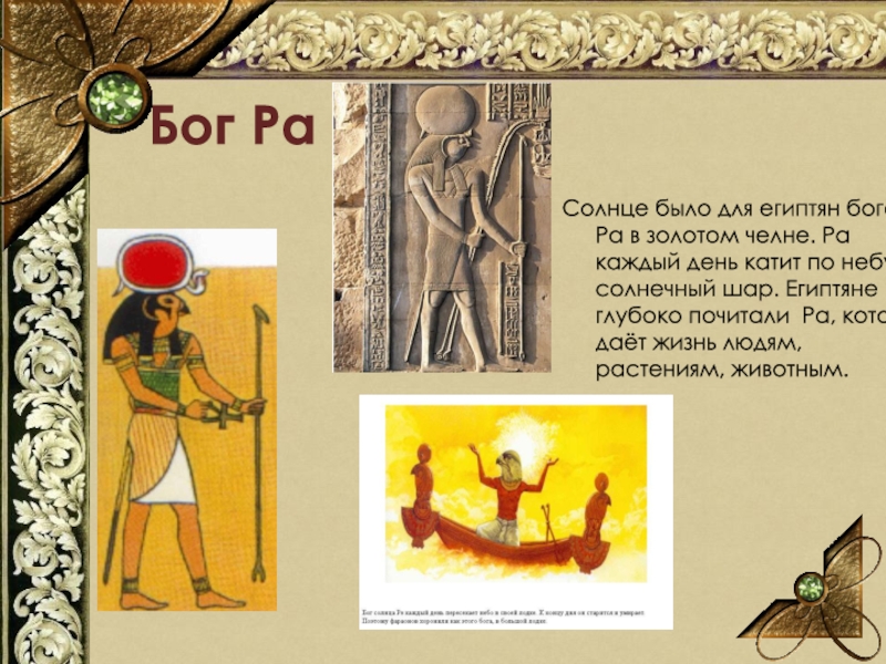 Бог РаСолнце было для египтян богом Ра в золотом челне. Ра каждый день катит по небу солнечный