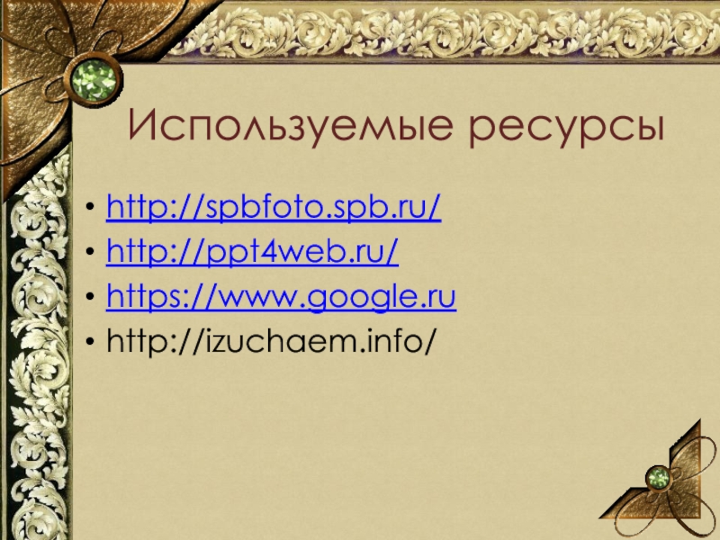 http://spbfoto.spb.ru/http://ppt4web.ru/https://www.google.ruhttp://izuchaem.info/Используемые ресурсы