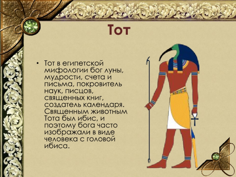наук, писцов, священных книг, создатель календаря. Священным животным Тота был ибис, и поэтому бога часто изображали в виде человека с головой ибиса.