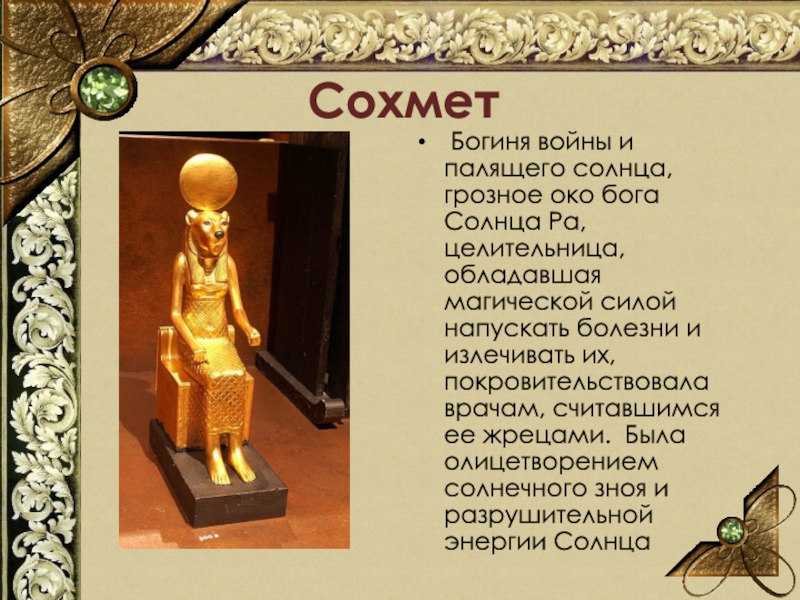 Сохмет Богиня войны и палящего солнца, грозное око бога Солнца Ра, целительница, обладавшая магической силой напускать болезни и