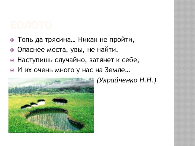 БолотоТопь да трясина… Никак не пройти,Опаснее места, увы, не найти.Наступишь случайно, затянет к себе,И их очень много у нас на Земле…