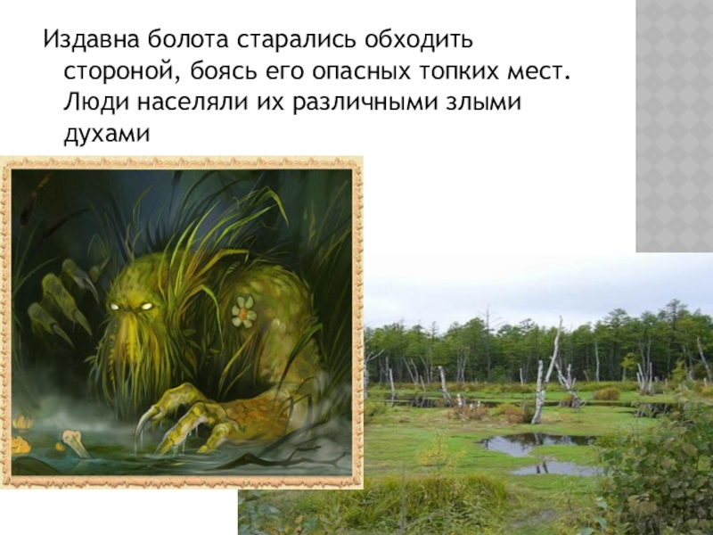 Слайд 3Издавна болота старались обходить стороной, боясь его опасных топких мест. Люди
