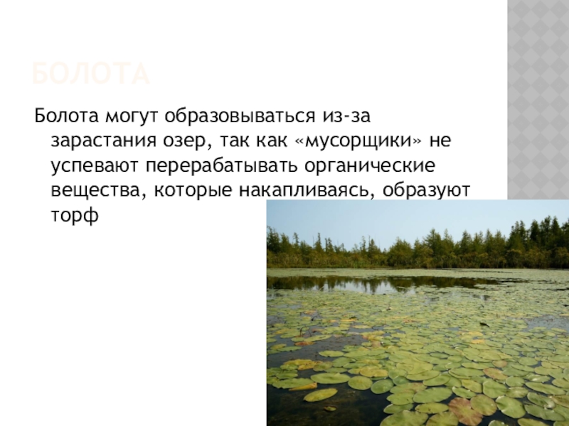 БолотаБолота могут образовываться из-за зарастания озер, так как «мусорщики» не успевают перерабатывать органические вещества, которые накапливаясь, образуют