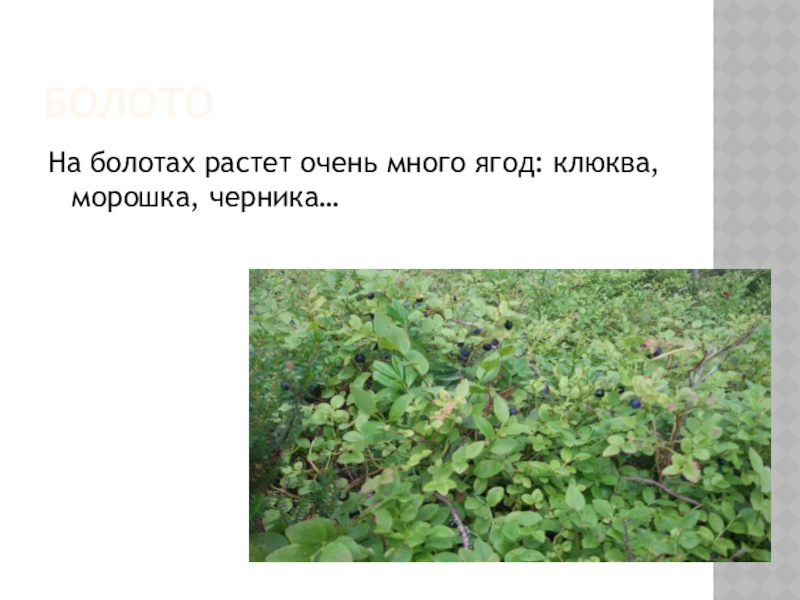 Болото На болотах растет очень много ягод: клюква, морошка, черника…