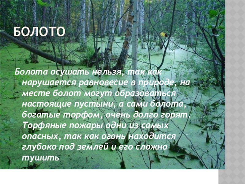 БолотоБолота осушать нельзя, так как нарушается равновесие в природе, на месте болот могут образоваться настоящие пустыни, а