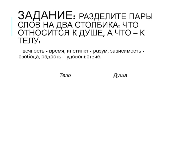 вечность - время, инстинкт - разум, зависимость - свобода, радость – удовольствие.