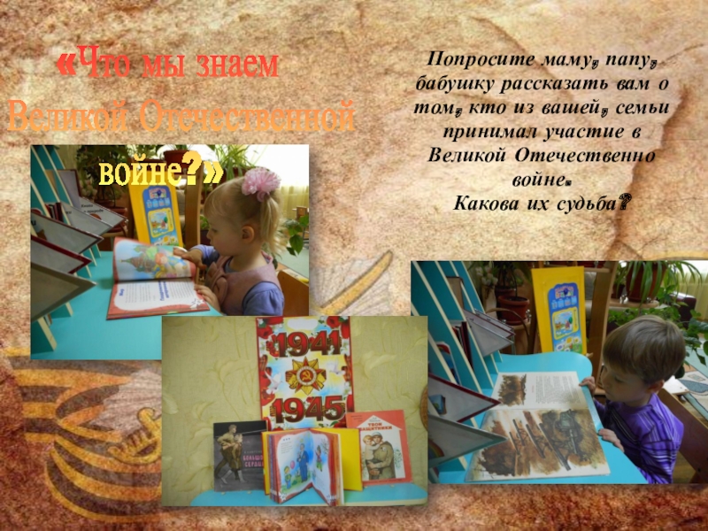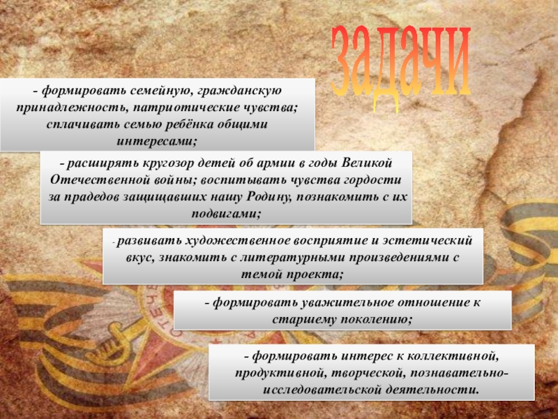 - расширять кругозор детей об армии в годы Великой Отечественной войны; воспитывать чувства гордости за прадедов защищавших нашу Родину, познакомить с их подвигами;