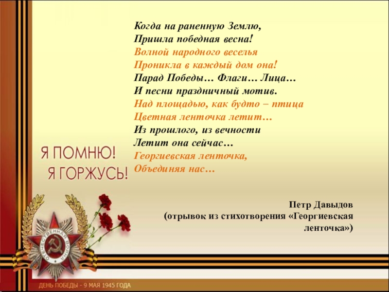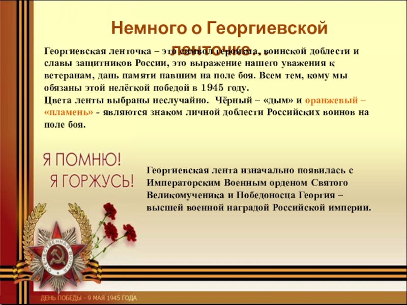 Георгиевская ленточка – это символ героизма, воинской доблести и славы защитников России, это выражение нашего уважения к ветеранам, дань памяти павшим на поле боя. Всем тем, кому мы обязаны этой нелёгкой победой в 1945 году.