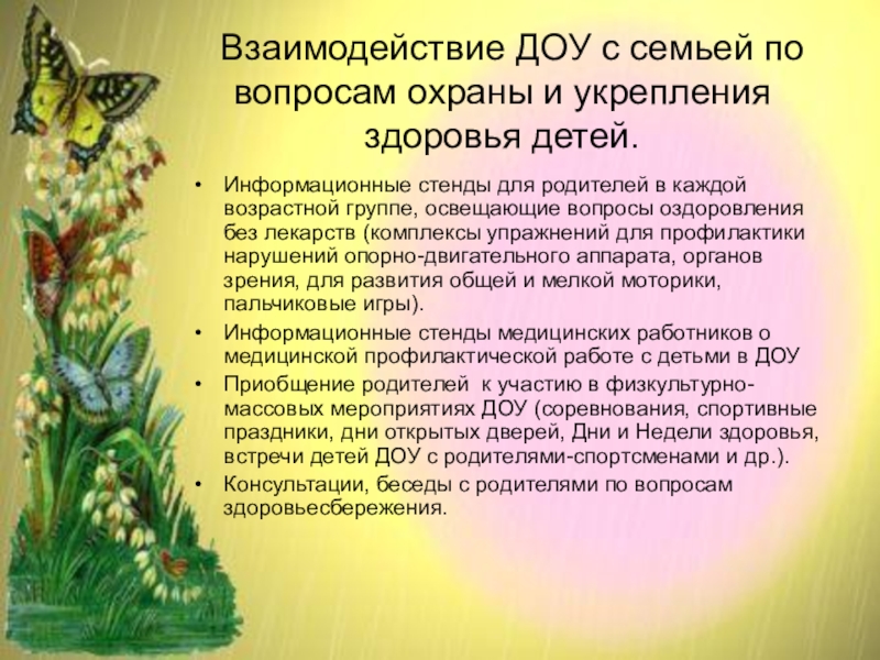 Информационные стенды для родителей в каждой возрастной группе, освещающие вопросы оздоровления без лекарств (комплексы упражнений для профилактики нарушений опорно-двигательного аппарата, органов зрения, для развития общей и мелкой моторики, пальчиковые игры).