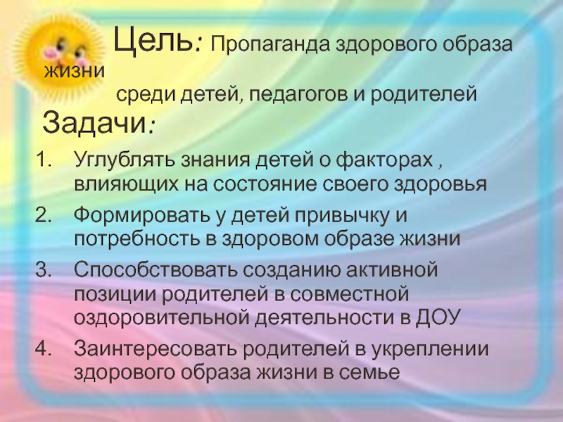 Способствовать созданию активной позиции родителей в совместной оздоровительной деятельности в ДОУ