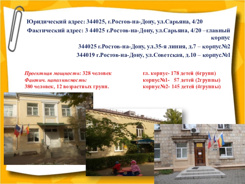 Проектная мощность: 328 человек гл. корпус- 178 детей (6групп)